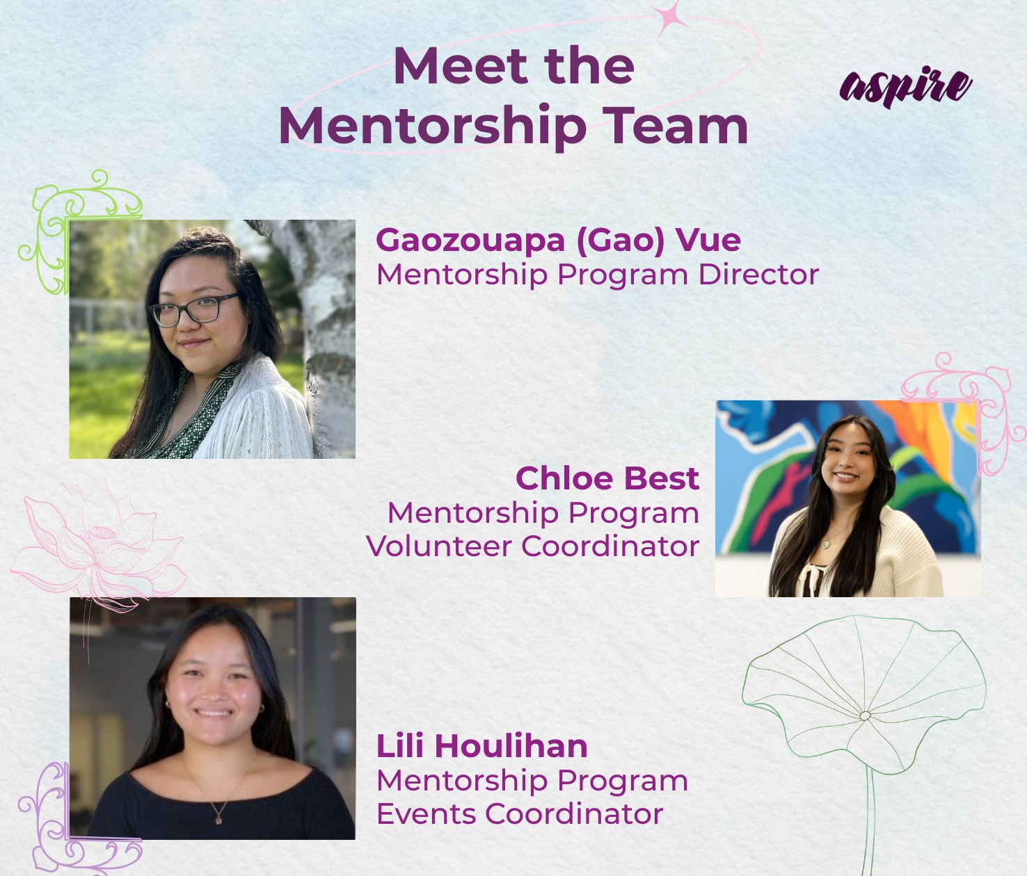 We are thrilled to welcome three new members to ASPIRE! Get to know the amazing individuals who make up the Mentorship Program team.